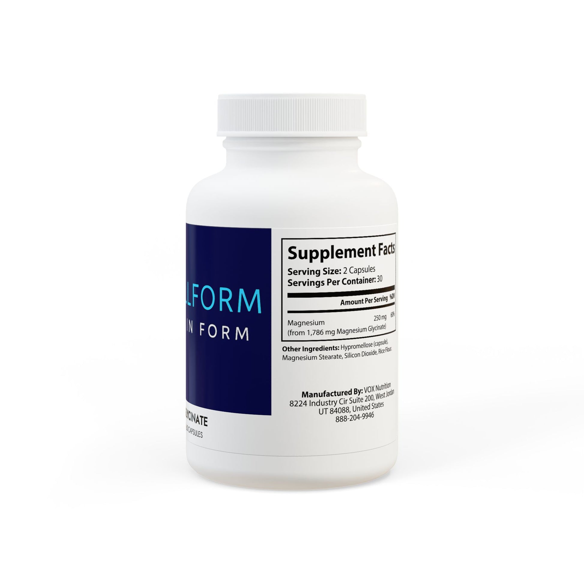 Ingredients: Magnesium (from 1,786 mg Magnesium Glycinate). Other Ingredients: Hypromellose (capsule), Magnesium Stearate, Silicon Dioxide, Rice Flour.